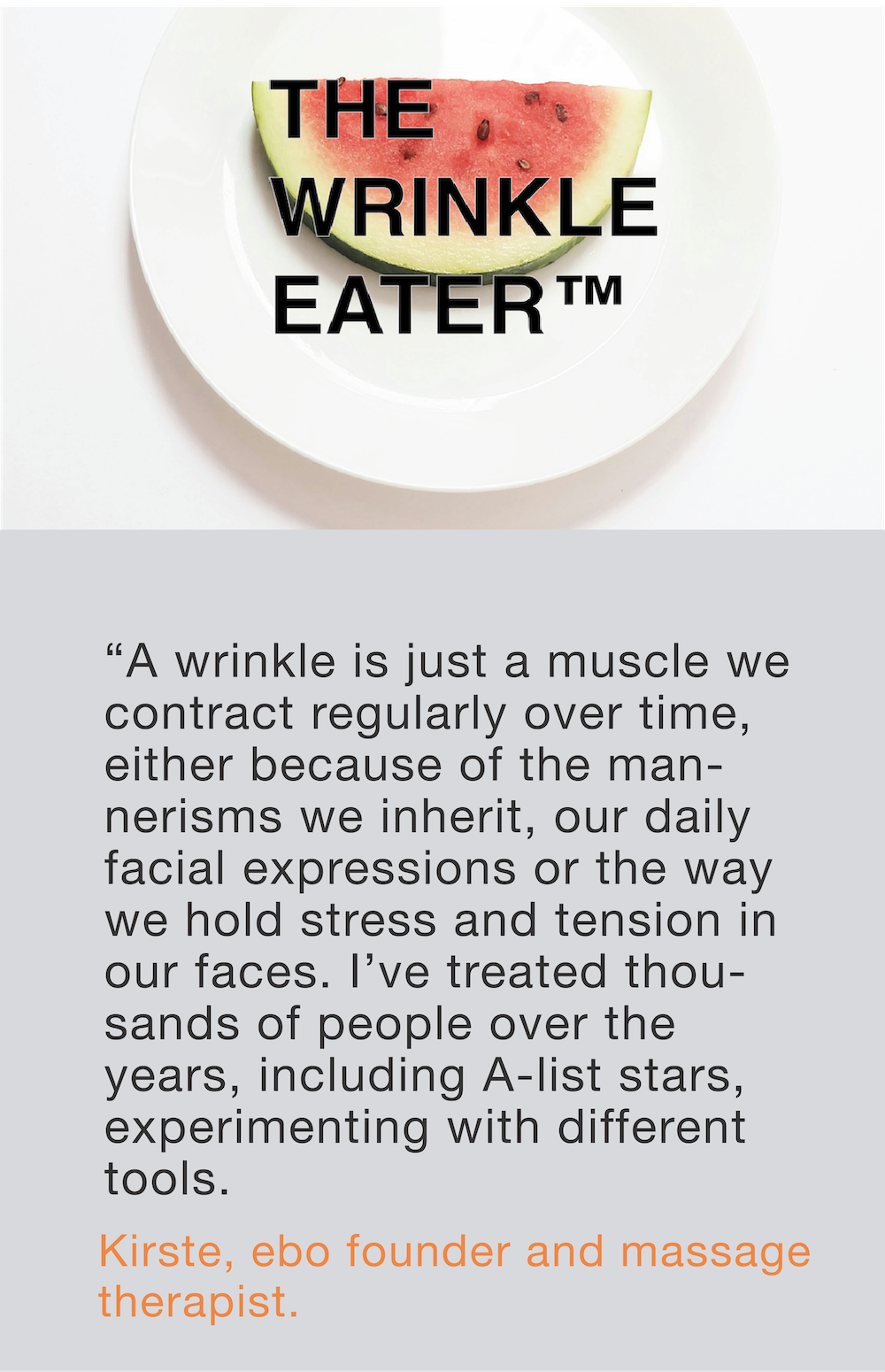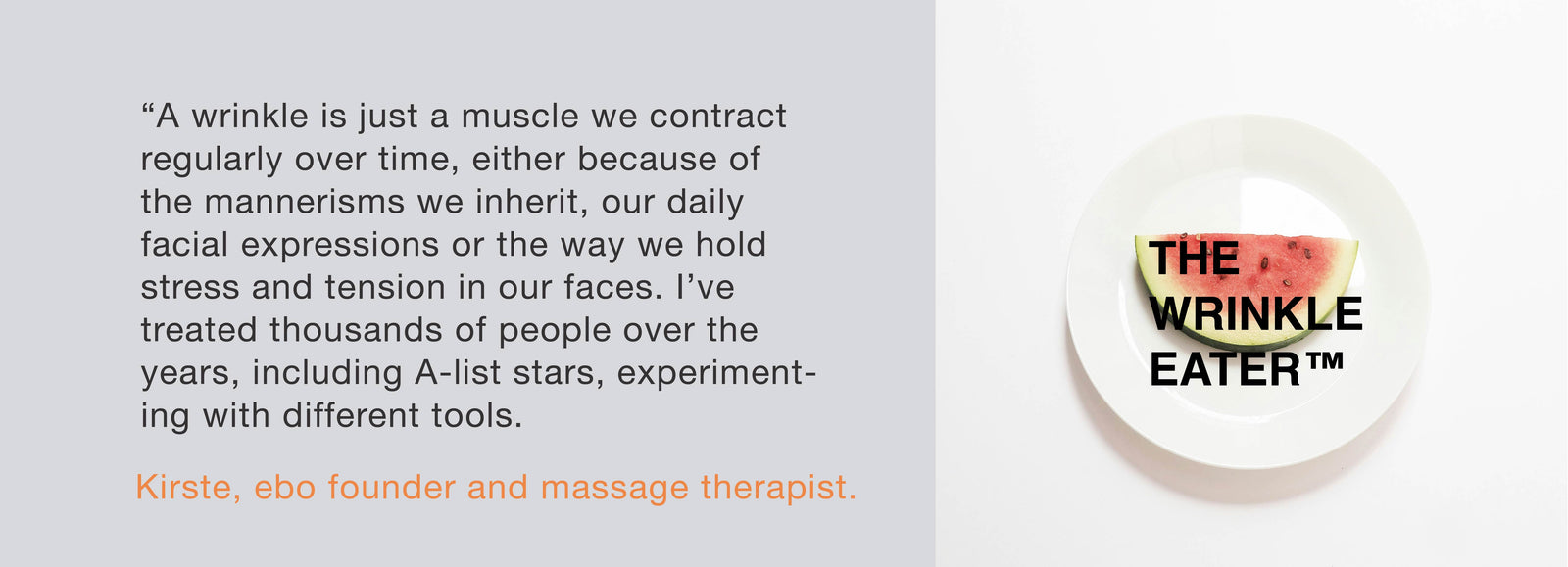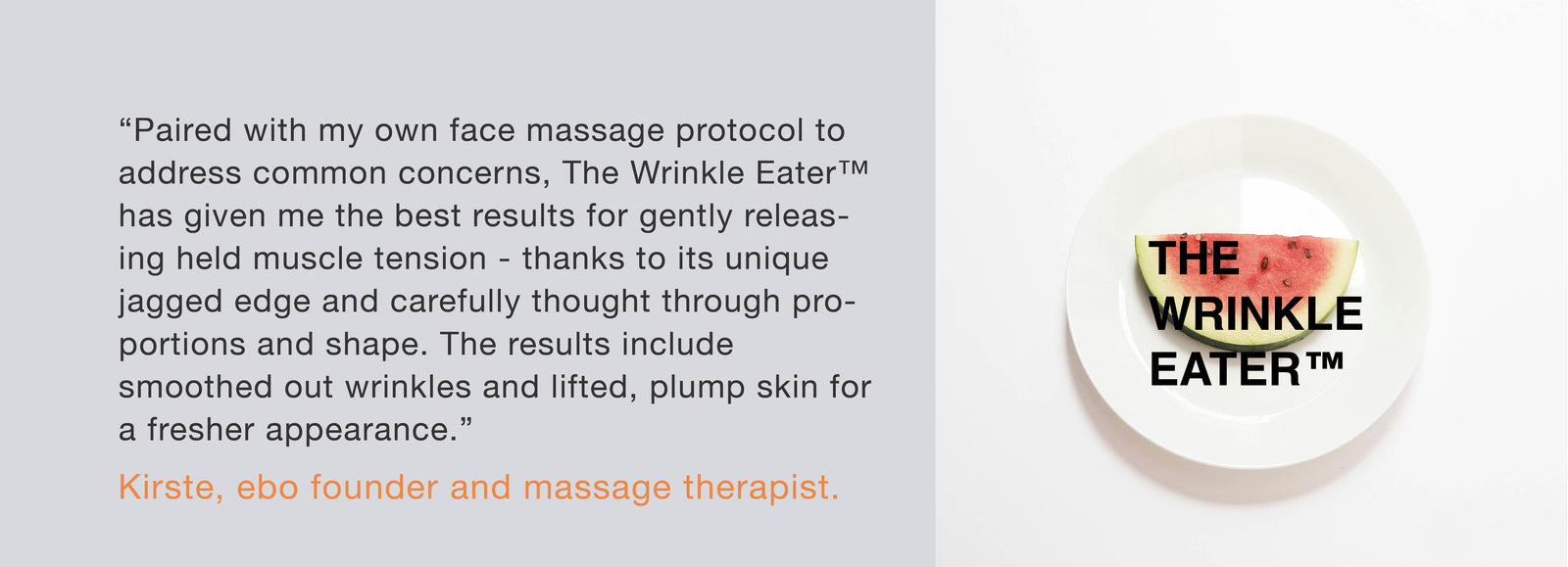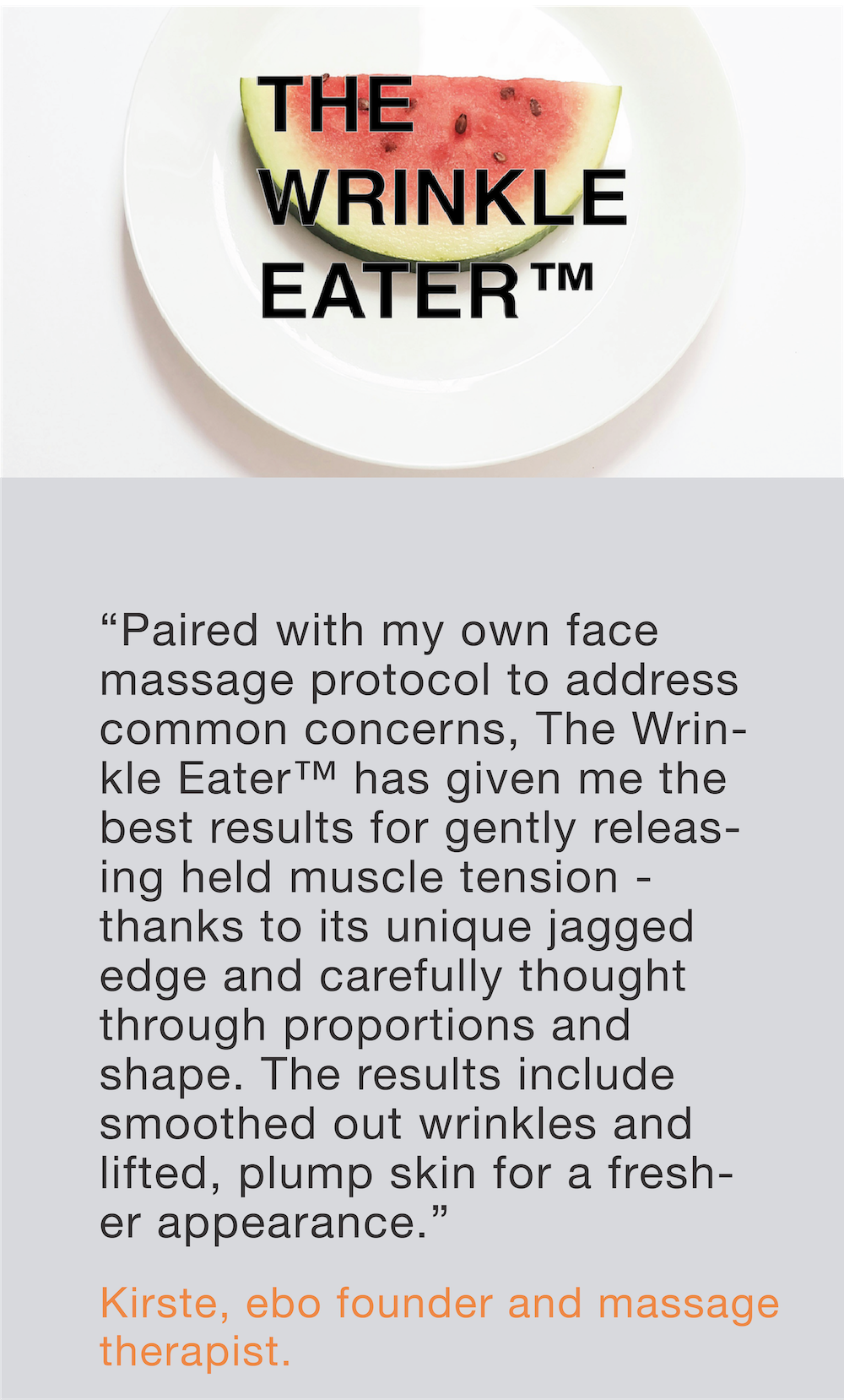 Transform your face naturally in just over five minutes a day. The Wrinkle Eater TM is our trademarked 'tooth-edged' face massage tool that comes with bitesize follow-along videos developed by ebo founder, Kirstie, who has been lifting faces - including A-listers - for 25 years.